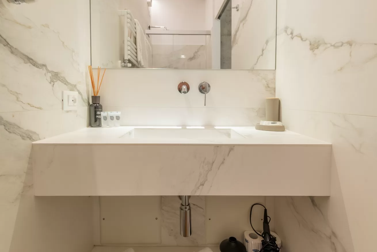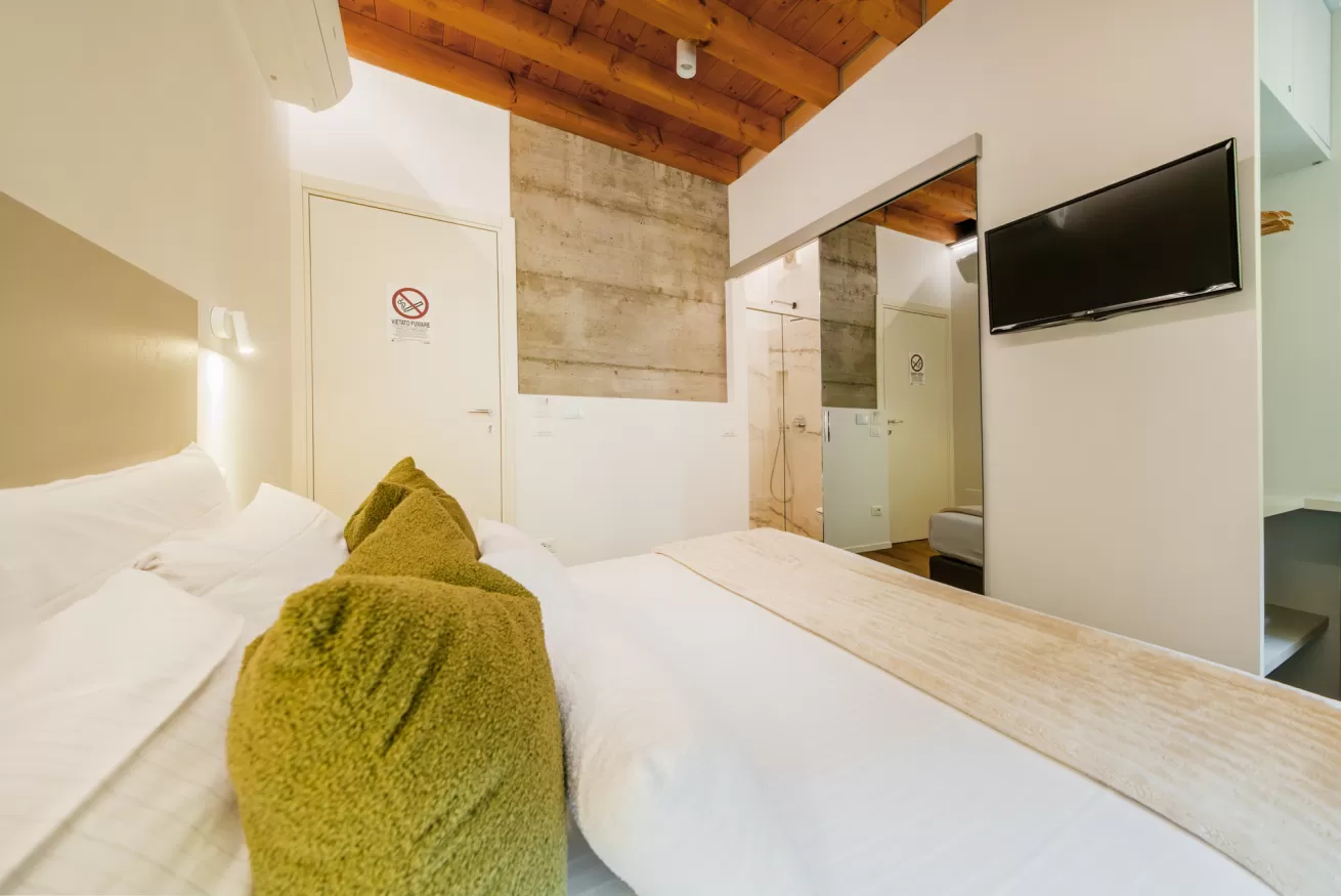 Le nostre Camere Matrimoniali sono nidi accoglienti e intimi, perfetti per una fuga romantica. L'arredamento minimalista ma caldo, il legno dei pavimenti e l'attento studio delle luci creano un'atmosfera di puro relax. Ogni camera dispone di un moderno bagno privato, il vostro santuario personale di benessere, ideale per rigenerarsi dopo una giornata passata ad esplorare gli scorci più poetici di Verona.
